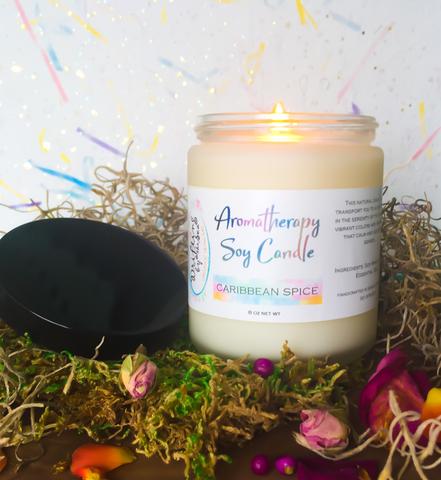 What better way to light up the heart and home this autumn than by burning a beautiful aromatherapy soy candle? This new blend, Caribbean Spice, is handpoured with essential oils of Cinnamon, Clove, Ylang Ylang, Mandarin, and Blood Orange.